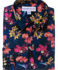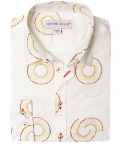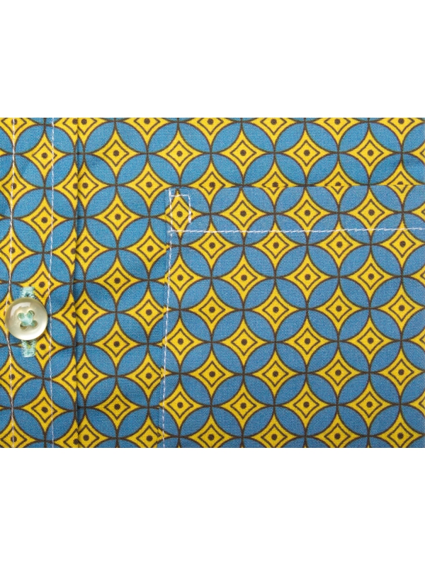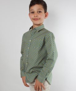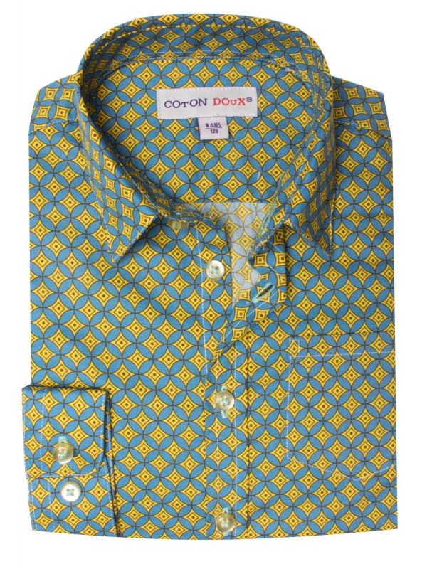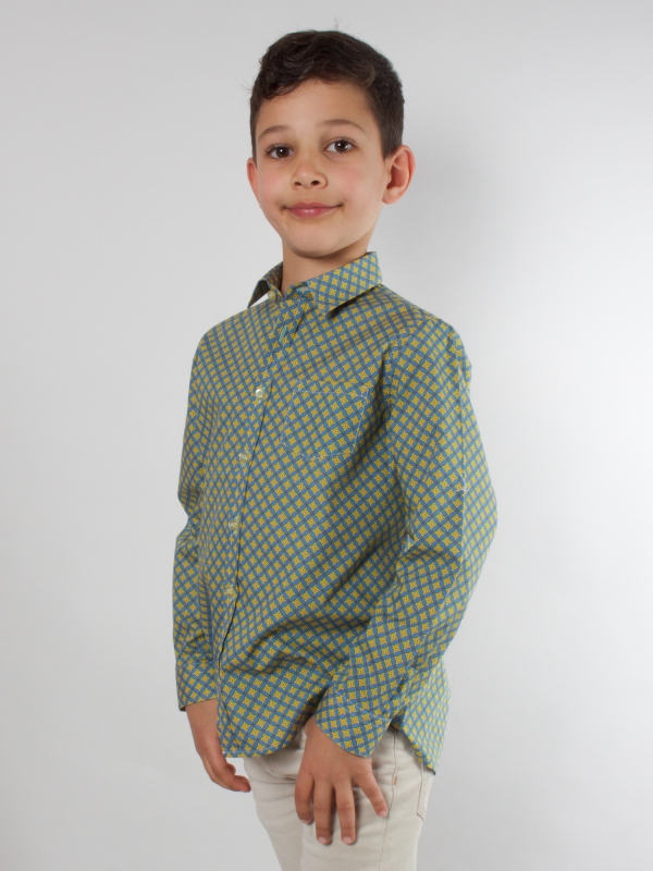 Is your son already a young little dandy? Make him happy with this shirt and its prints inspired by stained-glass window patterns where the combination of yellow and blue-grey has an effect of great elegance. Its close-fitting cut, its little collar and two-button cuffs are extremely trendy.
