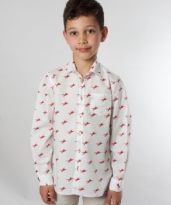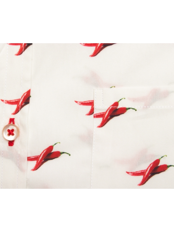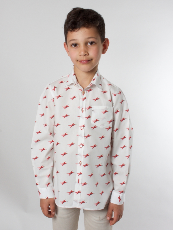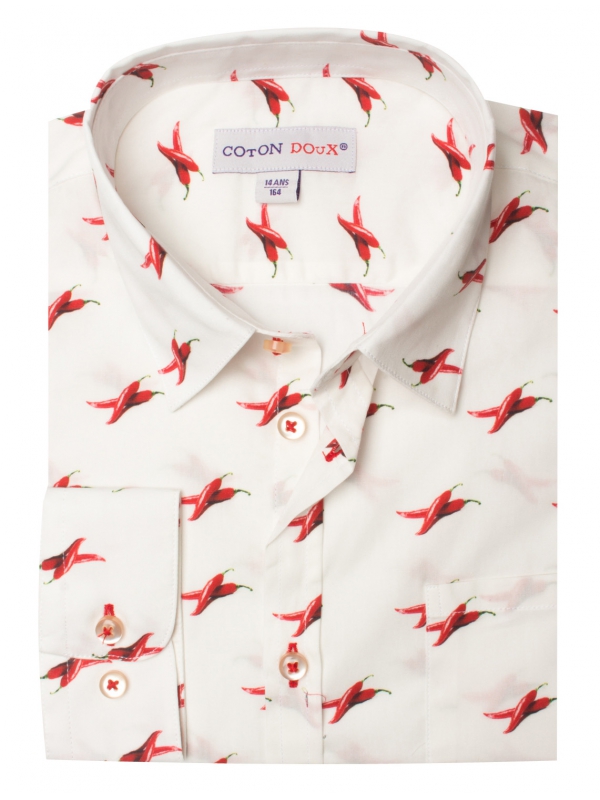 Here we have an alluring hot chilli print for a very elegant and very modern shirt with which your child will inevitably be trendy. Its little collar, close-fitting cut and two-button cuffs decorated with red overstitchings bring the final touch of trendiness.