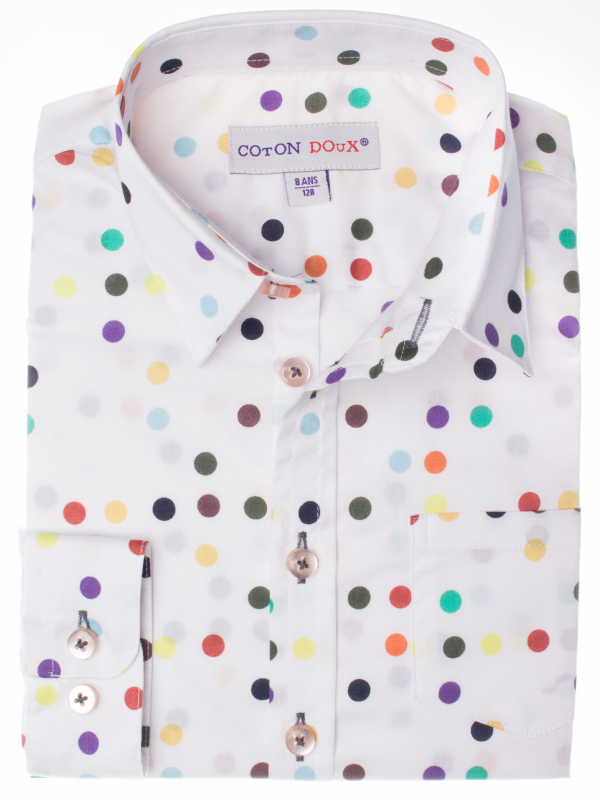 If the shirt is not his or her strength, opt for this “passe-partout” classic, yet playful shirt. Its colorful dots print on white background will perfectly match with a pair of jeans for a casual look. Your child will fall for its comfy charms thanks to its loose cut, soft collar and double-button cuffs.