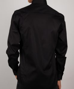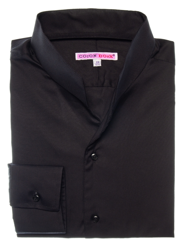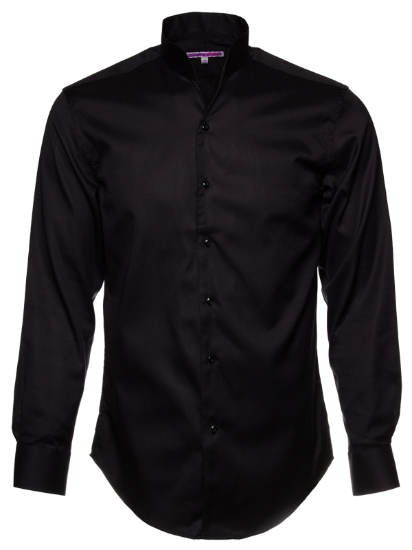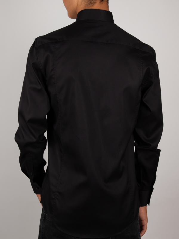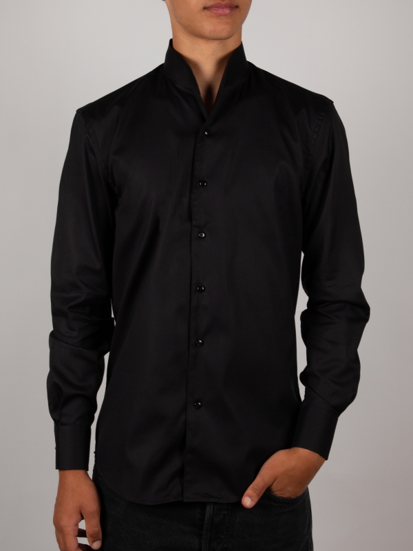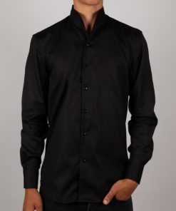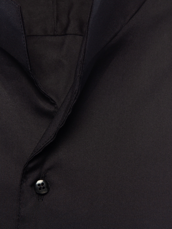 Timeless and refined, this black poplin shirt captivates with its tailored fit that flatters the silhouette. Its one-piece stand-up collar and simple cuffs give it a sleek and contemporary look. An essential piece for the modern man’s wardrobe, perfect from morning to evening.