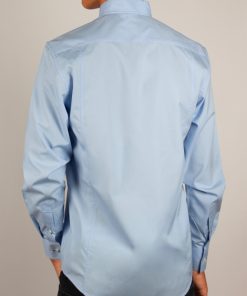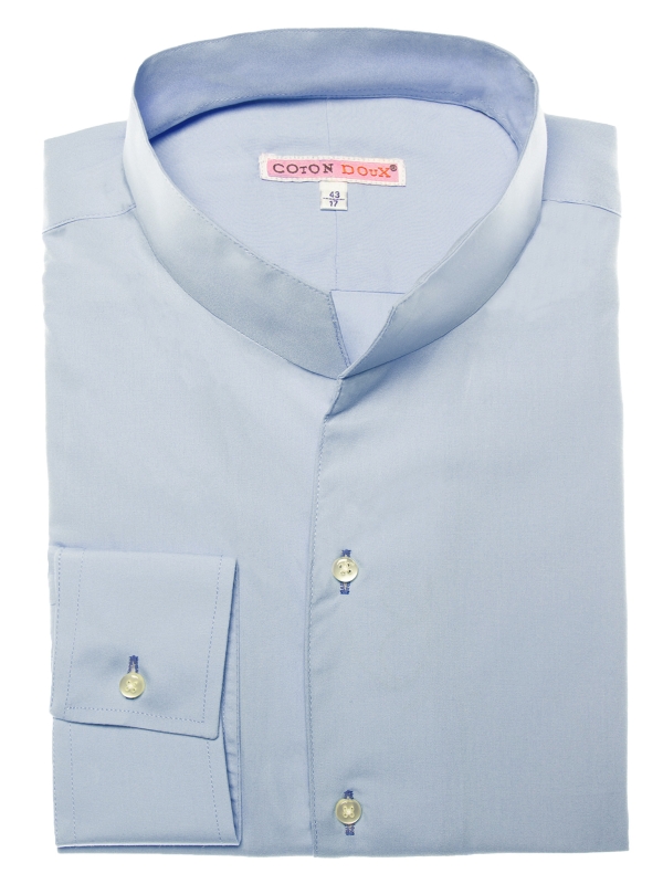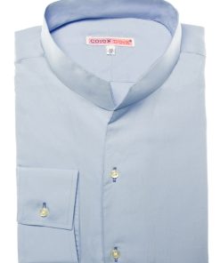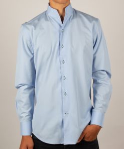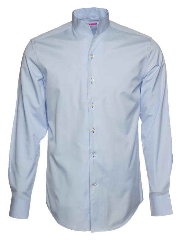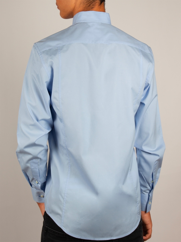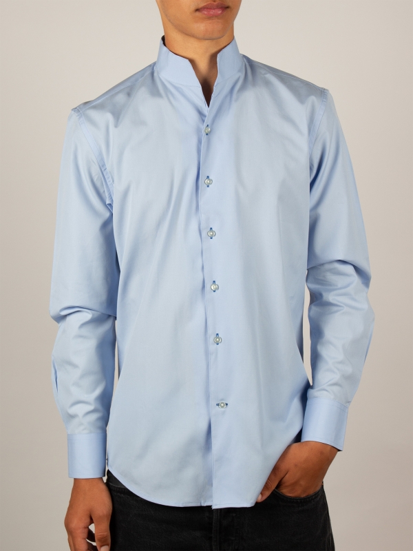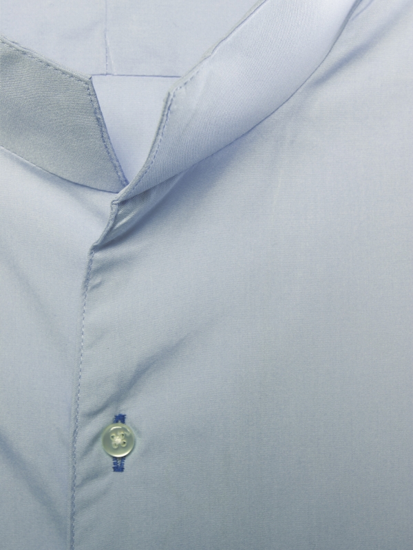 This light blue poplin shirt embodies understated elegance. Its regular cut subtly enhances the silhouette, while the smooth fabric ensures comfort and structure throughout the day. The one-piece stand-up collar adds a contemporary touch, subtly elevated by simple cuffs. A reliable choice for a polished look.