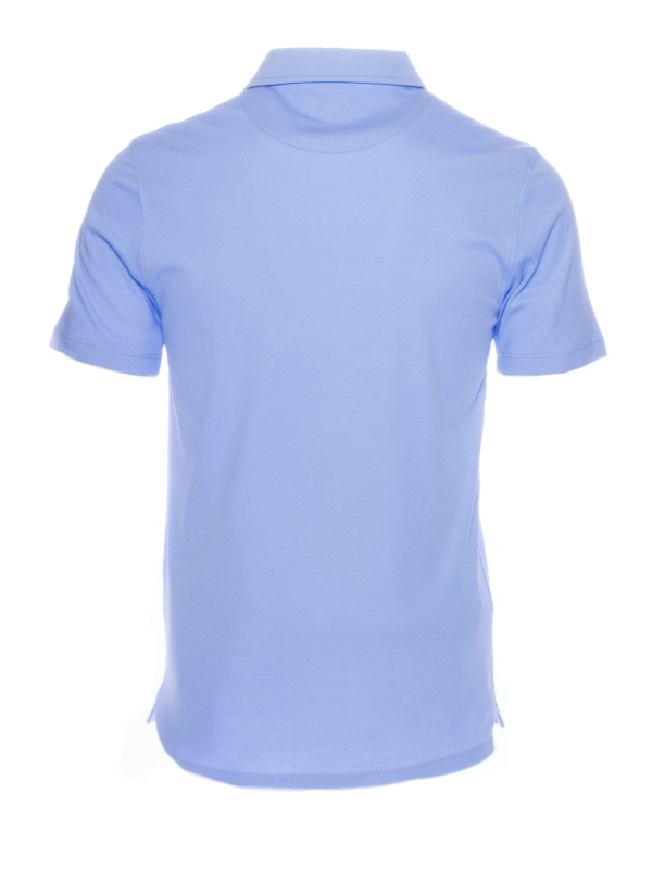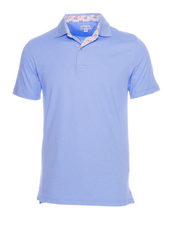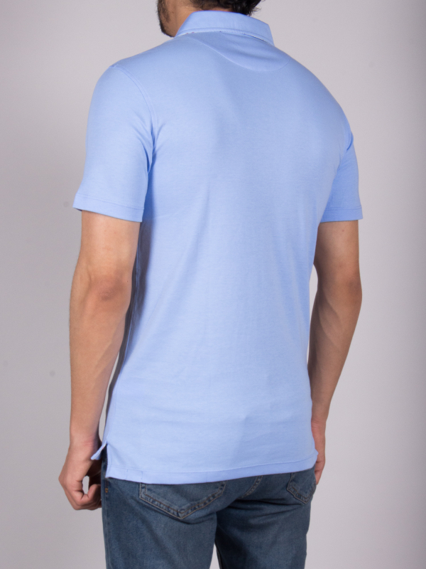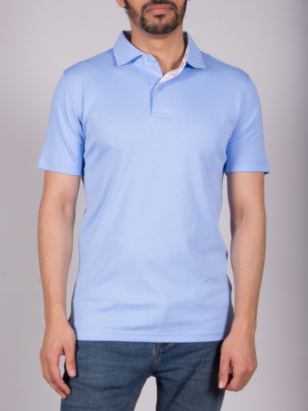 Blue and pink will be THE perfect combination of colors on this short sleeves plain light blue polo with flamingo inner lining print for an original look! The mercerized cotton jersey and the two-button placket will give you the comfort you are looking for without losing a piece of the elegance made by the cotton quilted collar and the regular cut. Bet on navy blue trousers to create a nice contrast and make the look perfect with black loafers!