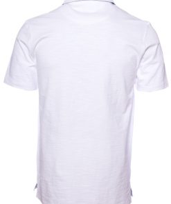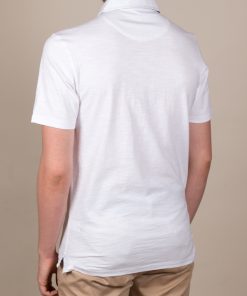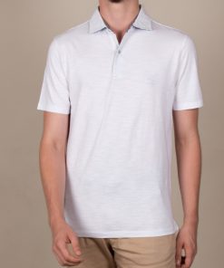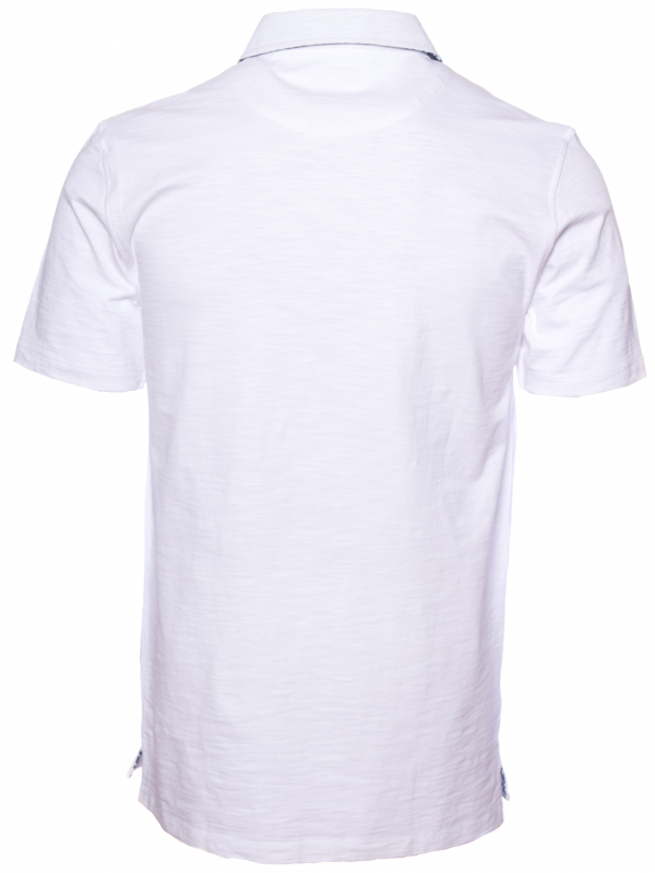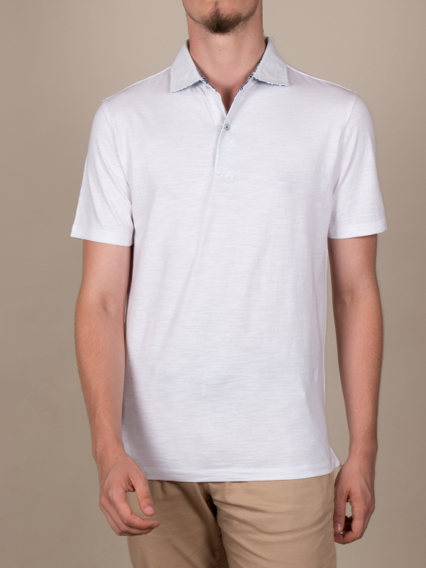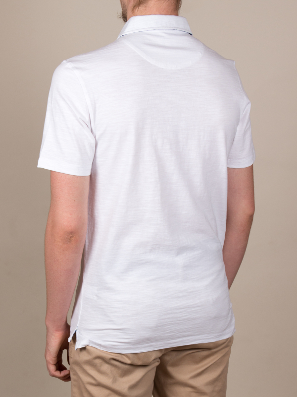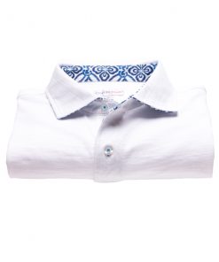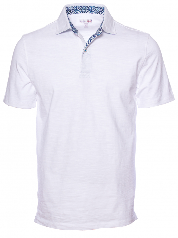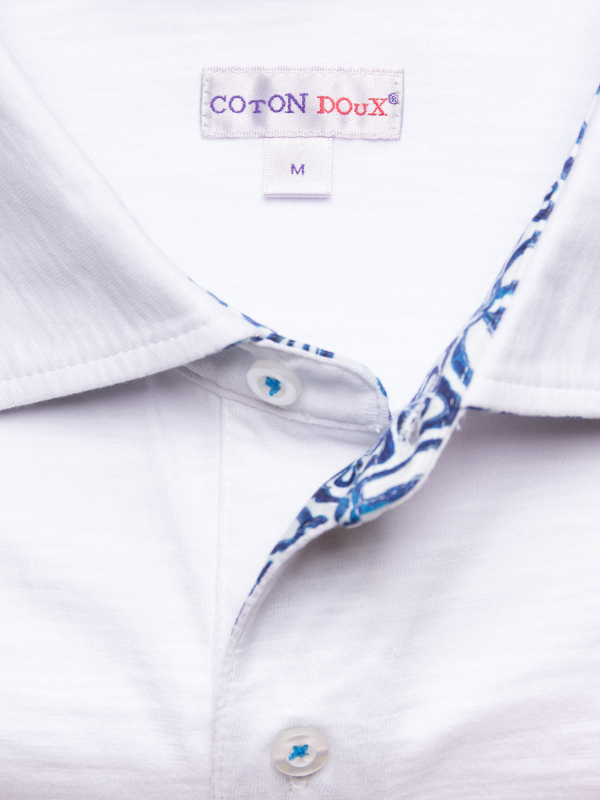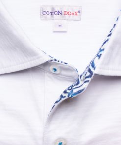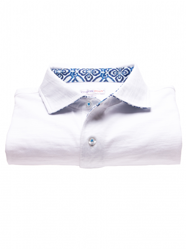Extend your summer by wearing this plain white polo shirt with azulejos inner lining print! Comfortable to wear thanks to its cotton jersey composition and its regular cut, you will also appreciate the elegance of its two-button placket. Wear it with a navy chino trousers for a Mediterranean style.