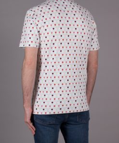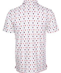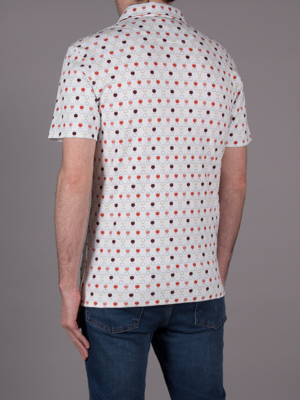 Epicurean at heart, enjoy this revamped wine glass print! With its geometric effect, it will be discretely worn over a burgundy chino, as a reference. Its cotton jersey composition and regular cut will also add to its charm, a pleasure to wear. Mark the contrast by highlighting its double button and its orange cotton piqué collar. This is a vintage outfit!