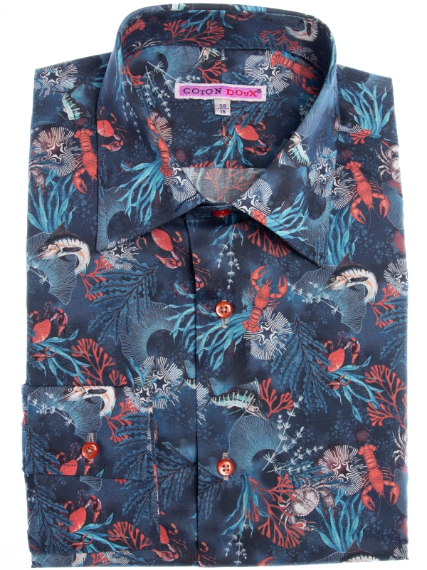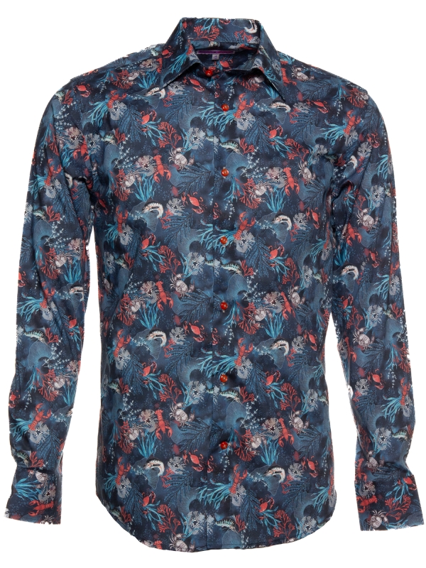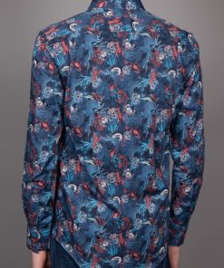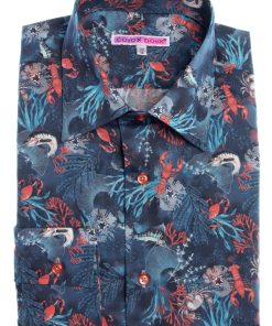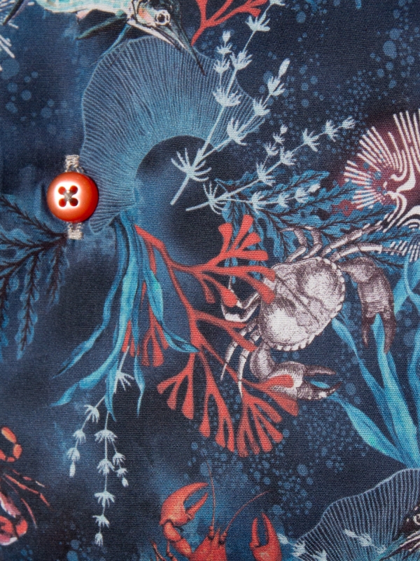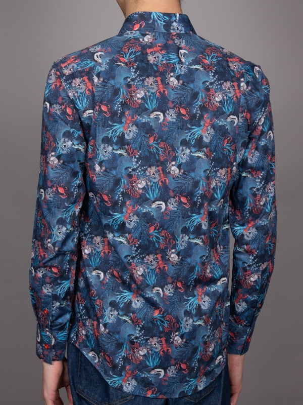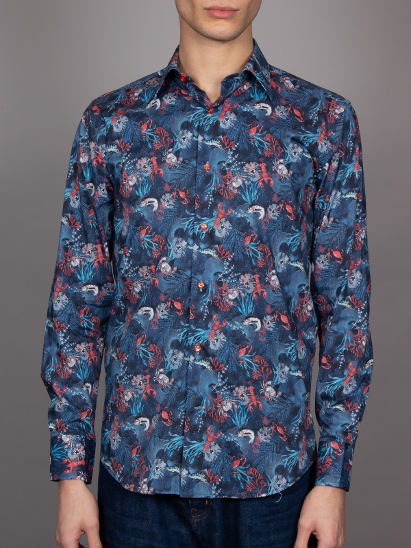 This shirt, featuring a captivating coral print on a rich blue background, takes inspiration from the vibrant life beneath the ocean’s surface. The design showcases a selection of ocean species, intricately woven into a colorful underwater scene. The Milanese collar, single cuffs, and regular fit bring a touch of refinement to this oceanic design, creating a unique blend of nature and sophistication.