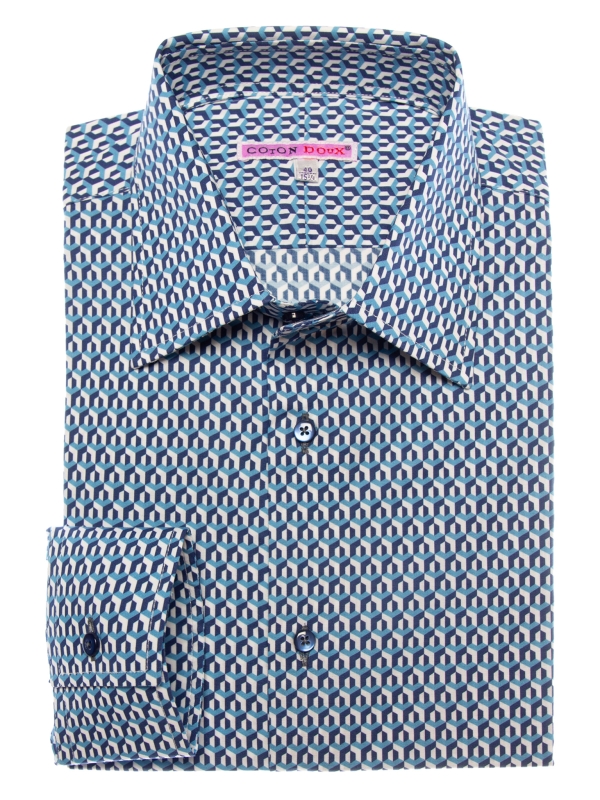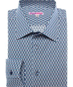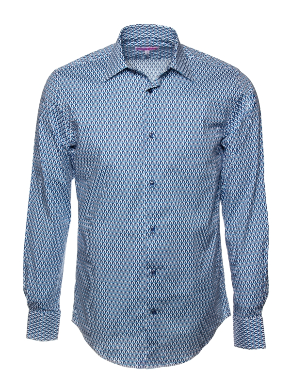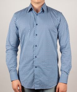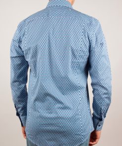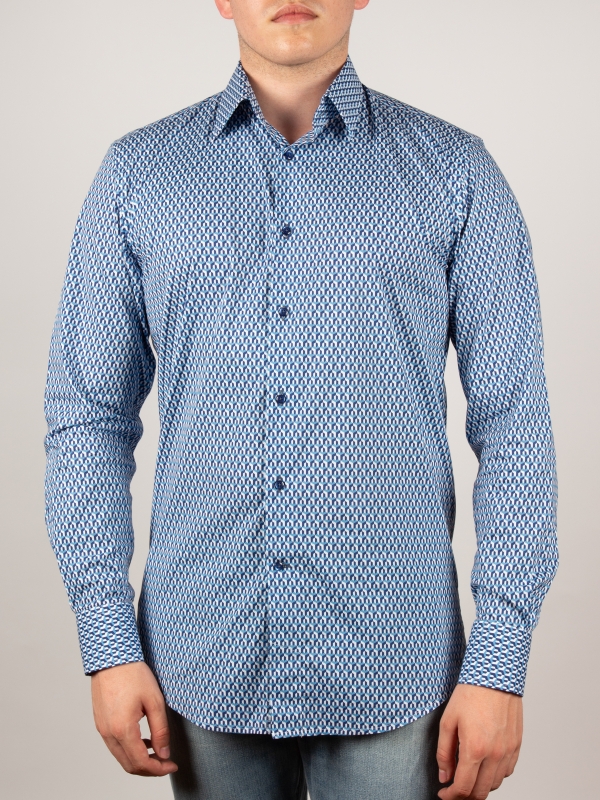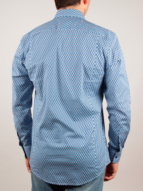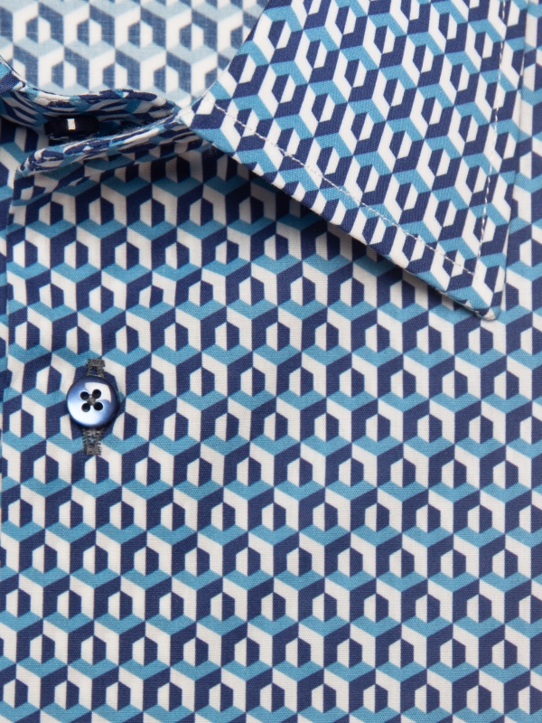 This geometric print shirt effortlessly combines elegance and contemporary style with its palette of light blue, dark blue, and white. The regular cut crafts a sharp, clean silhouette, while the Milanese collar and minimalist cuffs add a touch of refinement. The interplay of blue tones and geometric shapes creates a rhythmic, harmonious pattern that draws the eye.