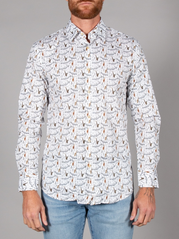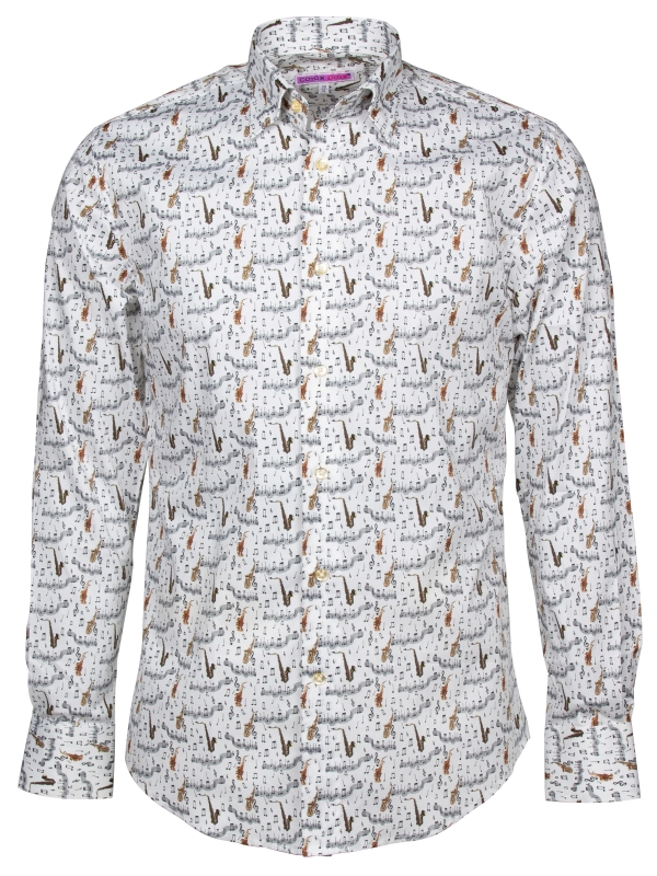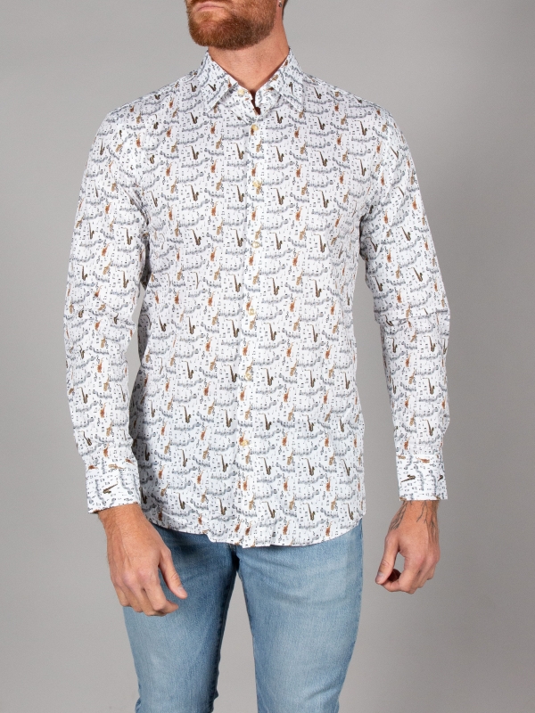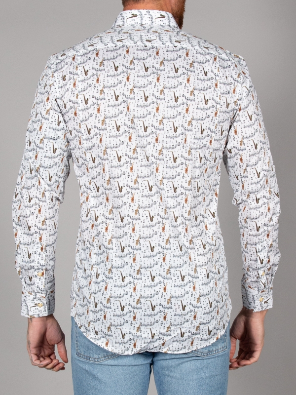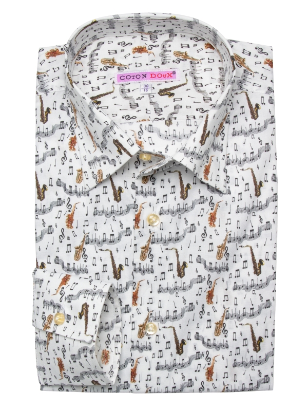 Wrap yourself in the melody of our Music Print shirt, where every note dances with poetic grace and harmony. The vibrant print sings a symphony of creativity.The Milanese collar lends a touch of refined rhythm, while the simple cuffs strikes a balance between style and comfort. Tailored in a regular fit, coordinate it with navy blue trousers and oxford shoes for a sophisticated and polished ensemble that complements the shirt’s artistic motif and elegant appeal.