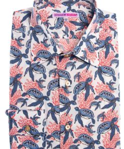 This shirt blends the serene elegance of the ocean with vibrant coral accents, featuring a playful turtle print that swims across a clean white backdrop. The harmonious mix of gentle turtles and bold coral evokes the natural beauty of the sea, capturing a moment of calm and vibrancy. The Milanese collar and single cuffs provide a touch of sophistication, while the regular fit offers relaxed comfort. Pair it with casual shorts for a look thatchannels the spirit of the ocean