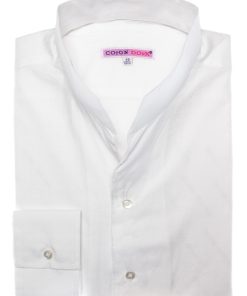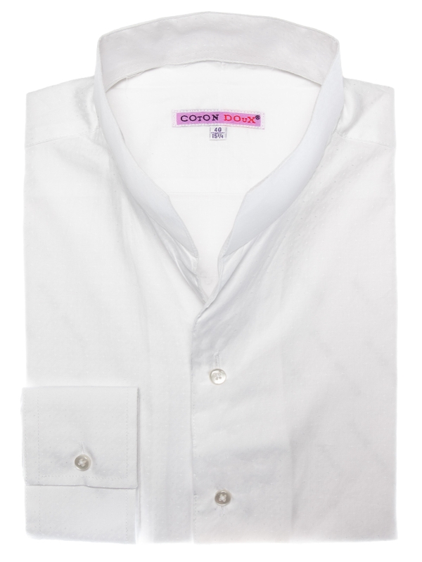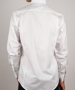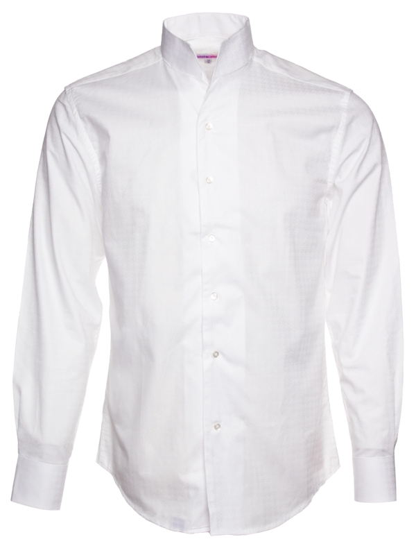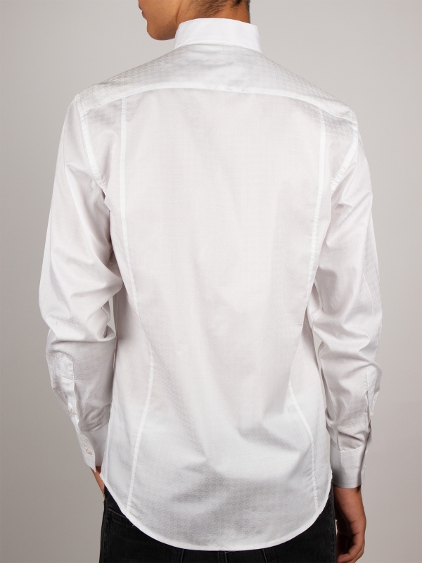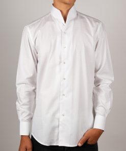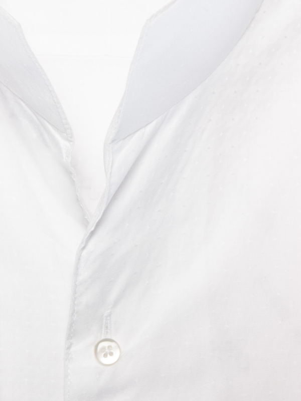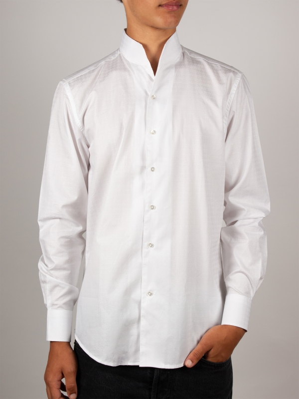 With its subtle raised jacquard patterns, this white shirt combines simplicity and refinement. Its stand-up collar, crafted in one piece for a smooth and clean line, along with its regular cut, make it an elegant and modern piece. Perfect for professional outfits as well as formal occasions.