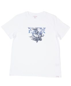 On a bright white background, this T-shirt features a stylized blue and white octopus framed by a striking triangular design. Made from mercerized cotton, it combines softness and durability. Its unisex straight cut, ribbed crew neck, and back neck yoke ensure perfect comfort. Side slits and double-needle stitching complete this modern and bold design.