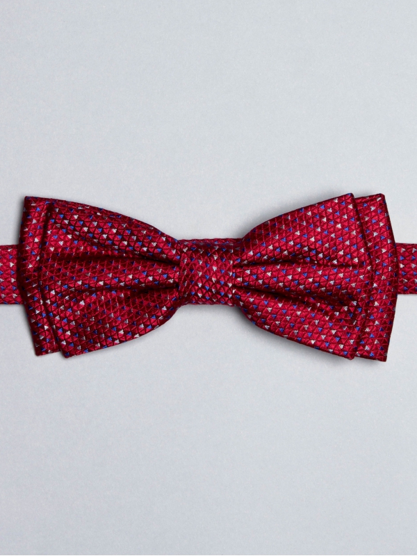 Light up your wardrobe with this red bow tie and its blue micro patterns. It will brighten your grey strip shirts and bring modernity and vitality.