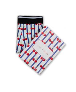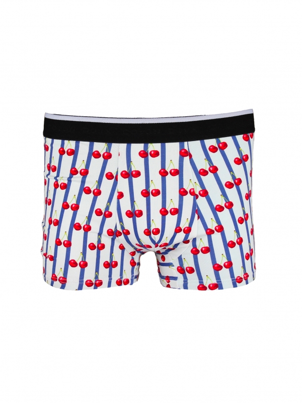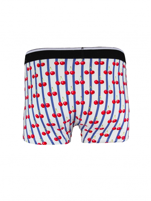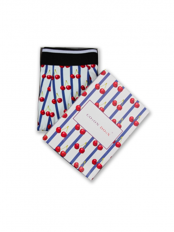 Our white with blue stripes cherry print trunks are made from cotton and elastane for a perfect balance between comfort and support. It features a black elastic waistband with Coton Doux on it, in case everyone wants to “pick” the brand of your underwear! No need to wait for cherry season, go for it!