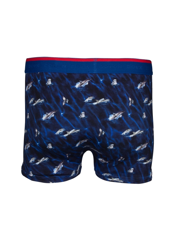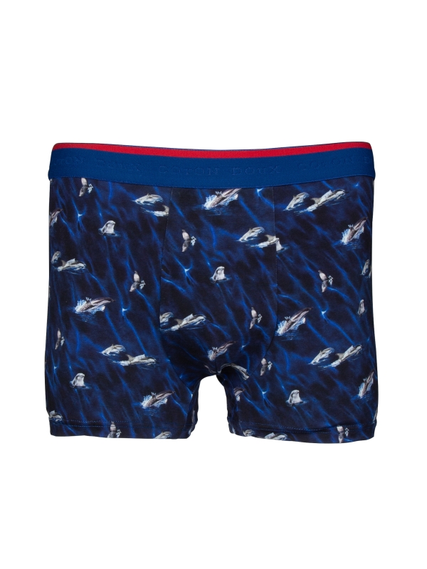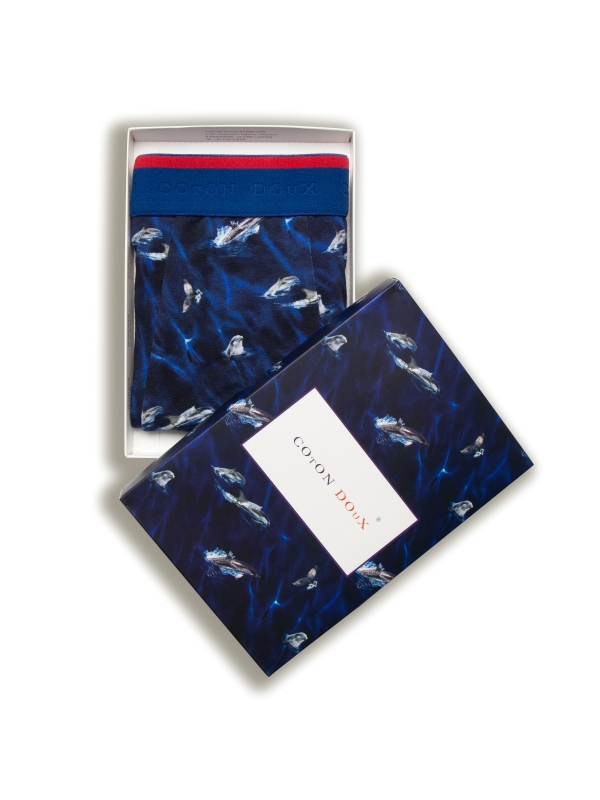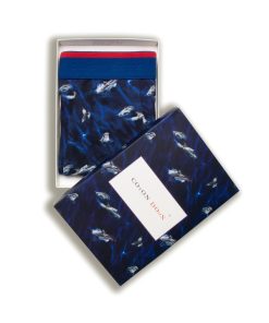 These trunks with dolphin print made from a cotton-elastane blend with flat lock seams and a blue elasticated logo waistband, these trunks offer a splash of playful charm and exceptional comfort.