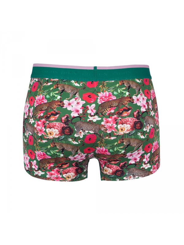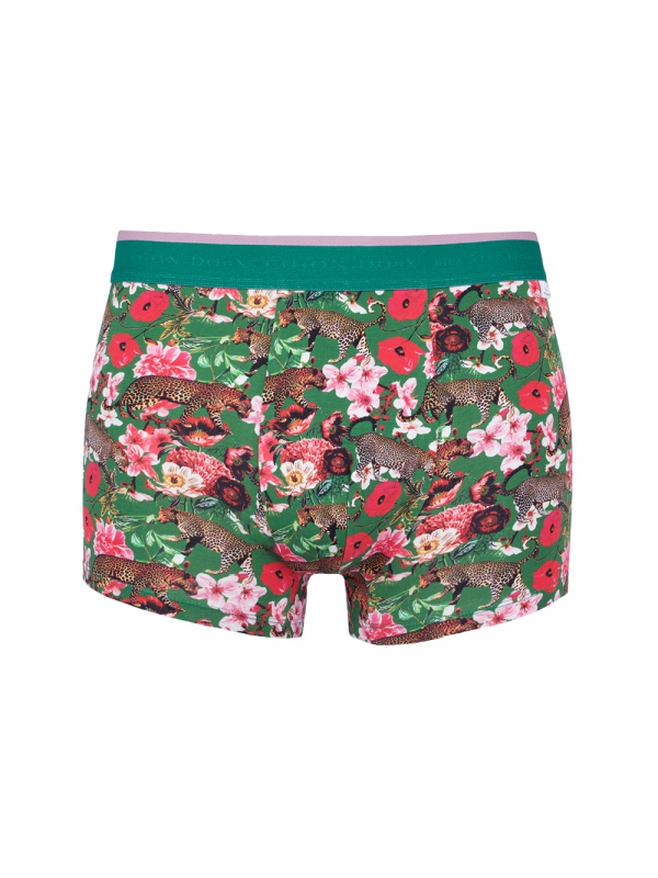 At ease in its tropical environment, the leopard appears upon these printed trunks between all the species of exotic flowers. Its cotton and elastic belt will guarantee you a nice, light fit. 93% cotton and 7% spandex.