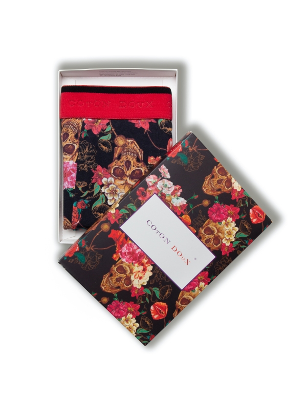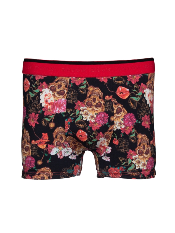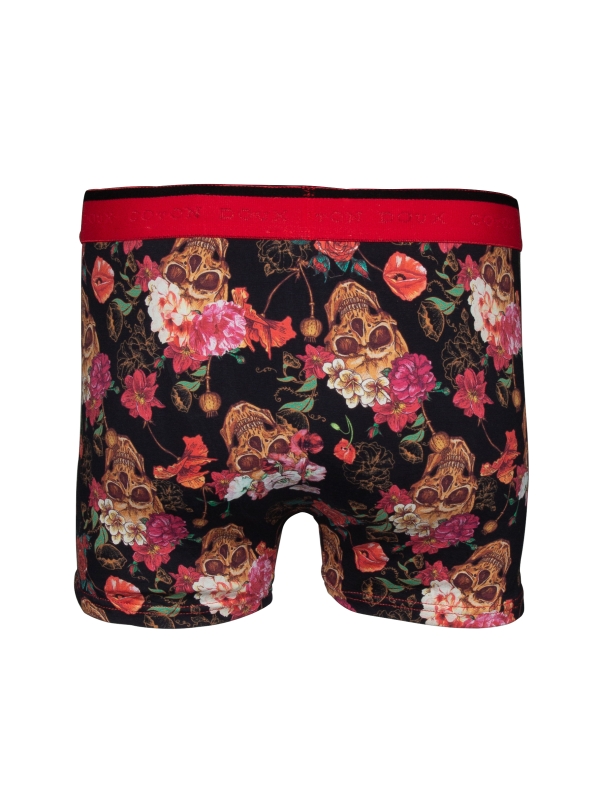 Featuring a striking skull and flower print, these trunks are constructed from a cotton-elastane blend with flat lock seams and a red elasticated waistband, delivering bold style and unrivaled comfort.