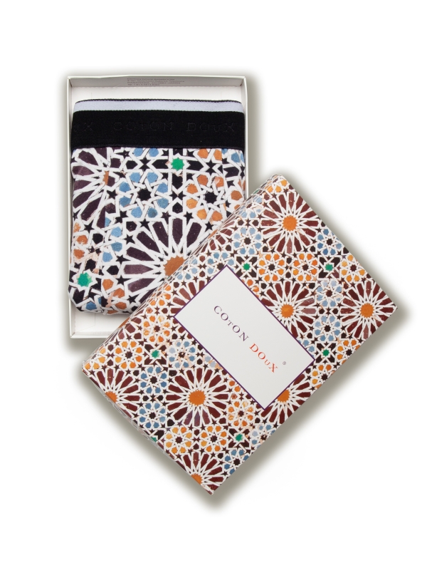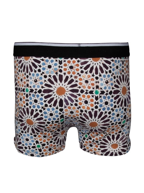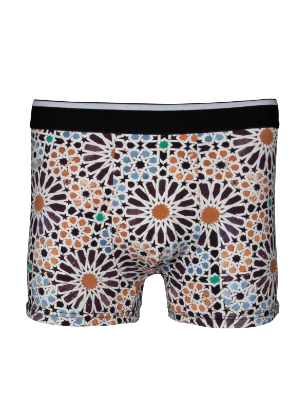 Constructed from a cotton-elastane blend with flat lock seams and a black elasticated logo waistband, these trunks combine intricate zellige patterns with unparalleled comfort for a stylish yet cozy fit.