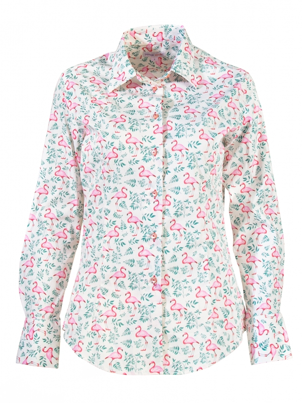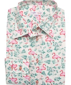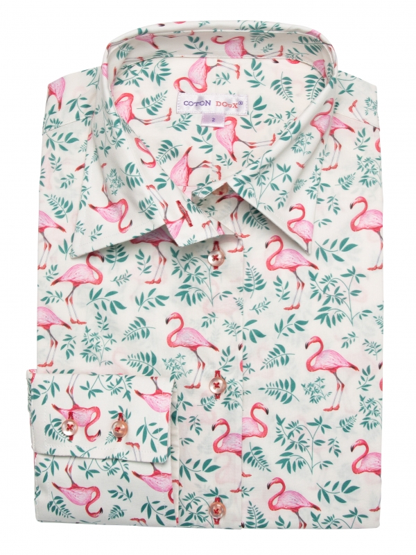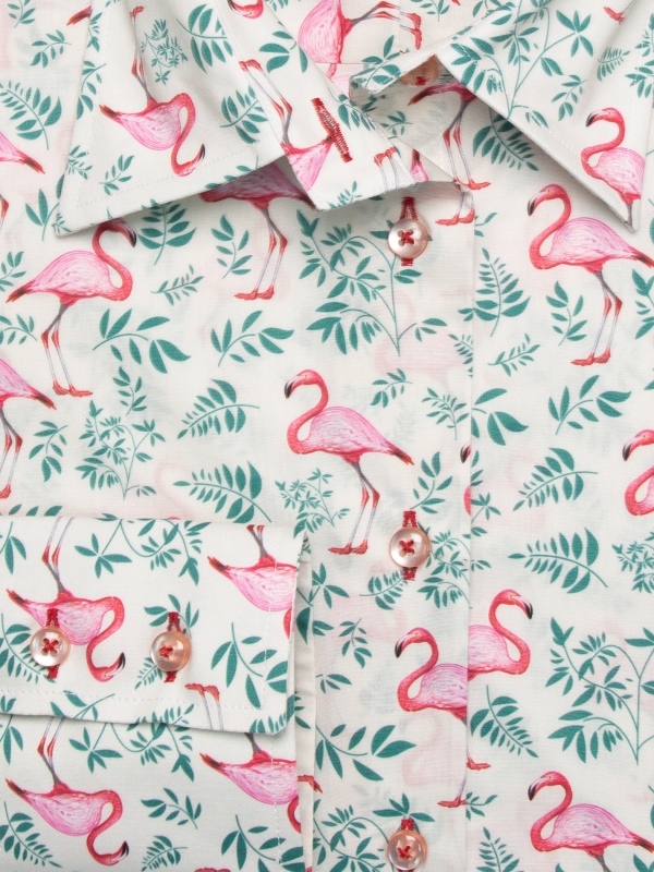 Fascinating in its size, its colours and its atypical appearance, the flamingo adorns up your shirt at the risk of you becoming fascinated yourself! Matched with the foliage and soft cream background, you’ll love wearing it with a cream chino for a striking look. There’s no need to be tightrope walker: the outfit looks perfectly with Espadrilles during the mid-season or brown derbies. Last but not least: classic collar, double-button cuffs and slim fit.
