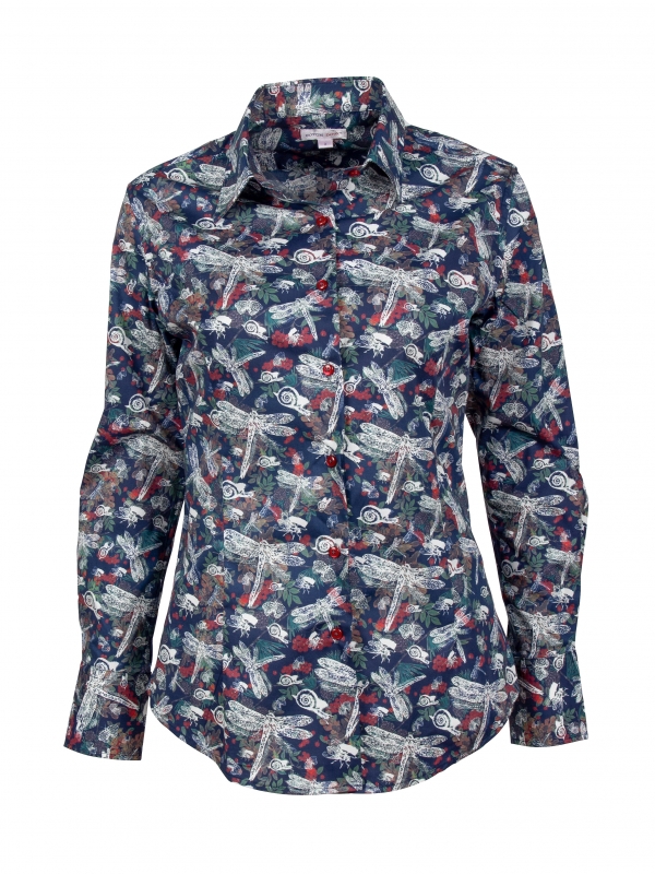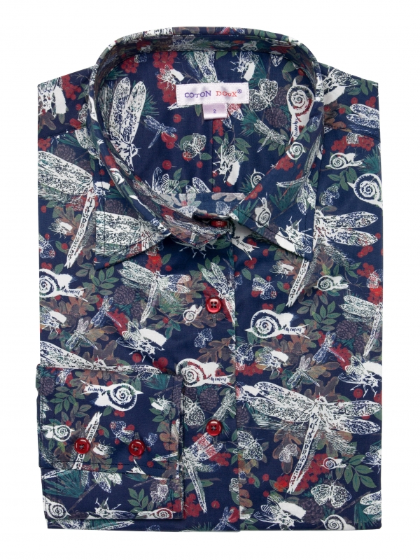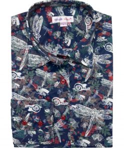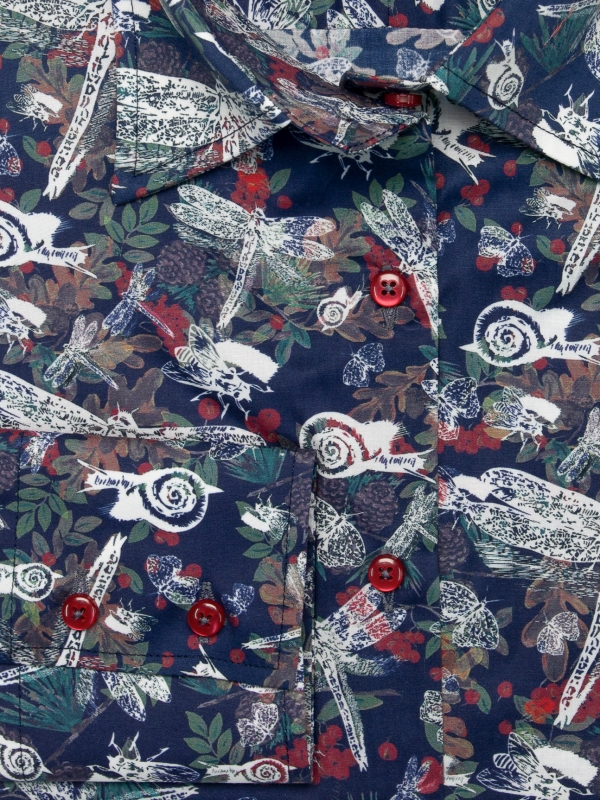 Embark on a celestial journey with our insect printed shirt. Set with a midnight-blue background, enjoy the sight of dragonflies, snails and butterflies living all together. The slim fit and classic collar ensure tailored comfort, while the double-button cuffs add a touch of subtle refinement. For a fresh, chic summer look, try teaming it with high-waisted white linen shorts and colorful canvas espadrilles. Let the charm work and your imagination flying away!