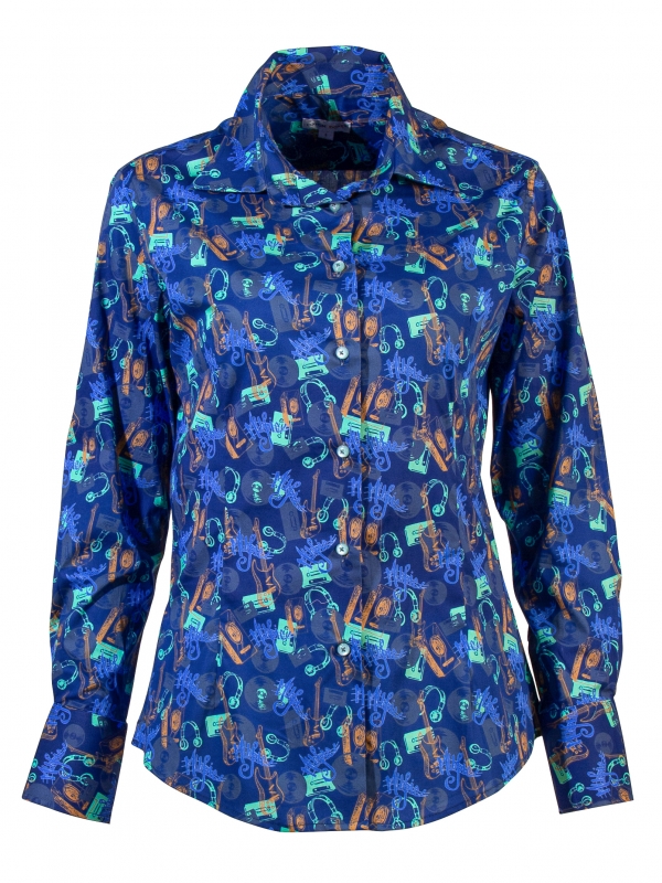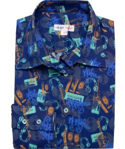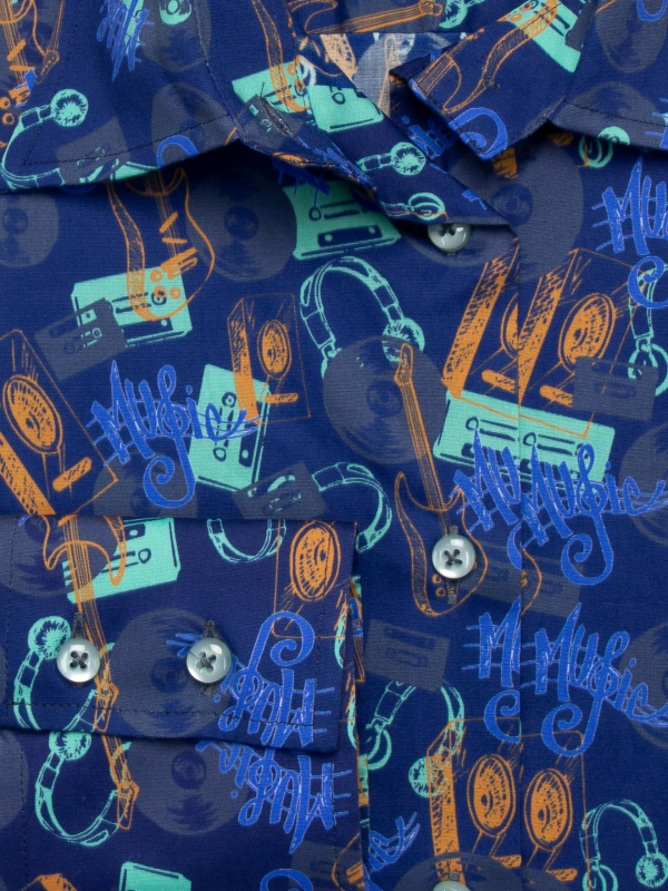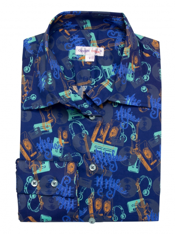 Whether it’s a G or an F, this slim-fit shirt with music print looks like the perfect musical key! Thanks to its dark blue shade, it will match all your jeans, day or night, and you can play with a green or orange jacket to make the guitars, headphones, etc. stand out. A little tip: make your classic collar and double-button cuffs stand out. It’ll be the perfect musical chord!