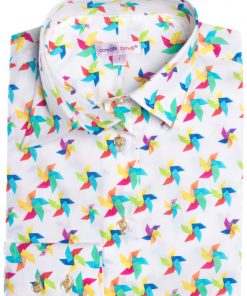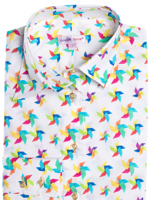 Let the wind of style blow on this slim fit shirt with windmill print. Its vividly colorful touches on the white background will brighten up any outfit, for example mustard trousers and sandals. Its classic collar and double-button cuffs will give you a burst of elegance!