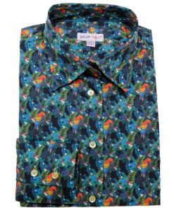 You love parrots? So this brightly colored parrot print blouse with a slim fit will take you to the rainforest. Its classic collar and double button cuffs will be chic to wear.