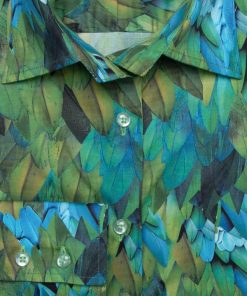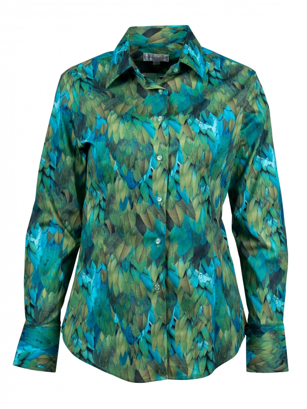 Explore the unmatched elegance of this peacock feather-print shirt that invites you into a world where fashion takes flight with grace! Featuring a classic collar and double-button cuffs, this shirt comes with a tailored fit for a distinguished look. Create a chic and colorful ensemble by pairing this shirt with a fitted black corduroy pants and emerald green suede ankle boots to echo the color of the feathers. Add a touch of sophistication by wearing a long black wool coat, reminiscent of the splendor of nature. Celebrate the beauty and grace of nature and let yourself be carried away by its exotic elegance.