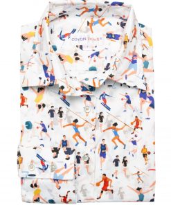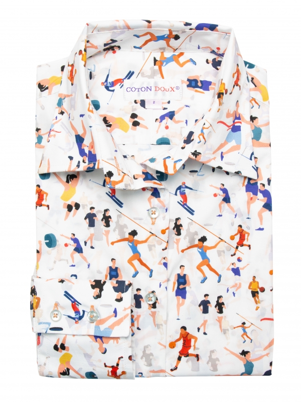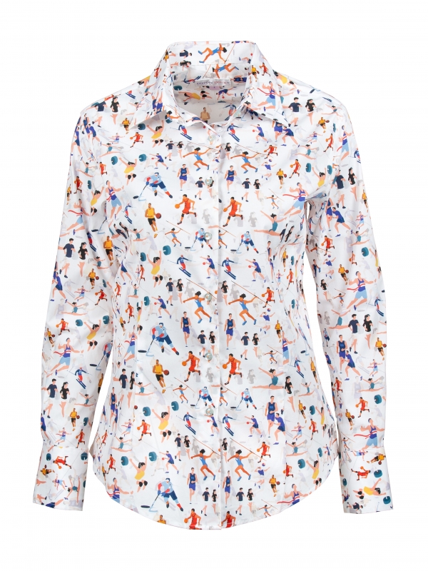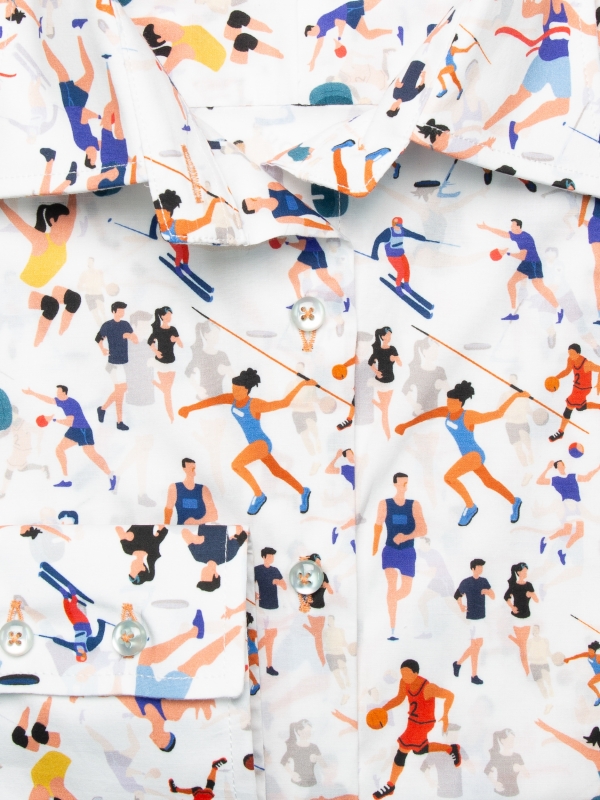 Embody your passion for movement, competition, and outdoor activities with this sports-print shirt! Featuring a classic collar and double-button cuffs, its tailored fit combines elegance and vitality to keep up with all your movements. Pair it with brown leather pants and white sneakers, then add a white cardigan to stay warm throughout the season. You’ve got yourself a classic sporty-chic outfit!