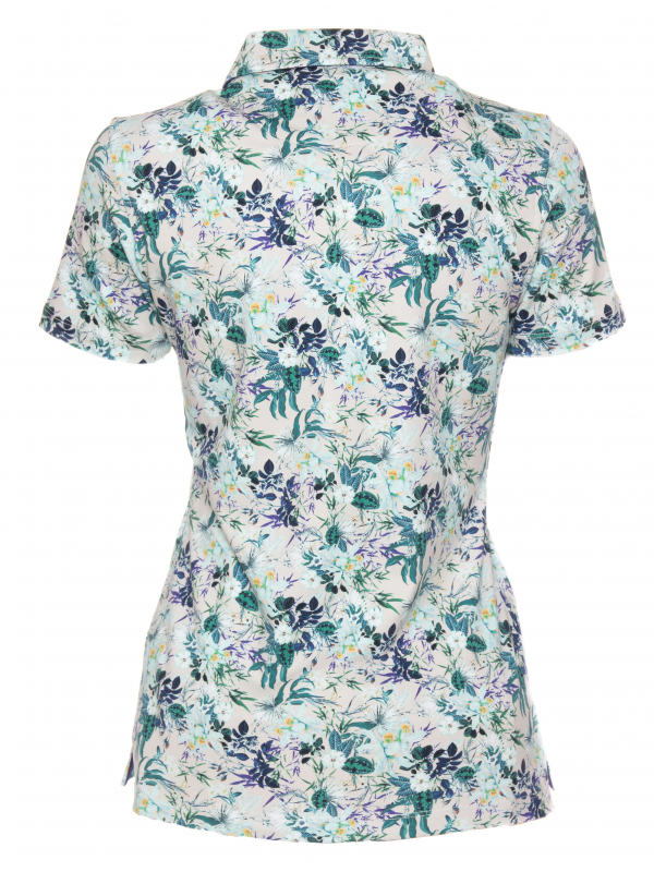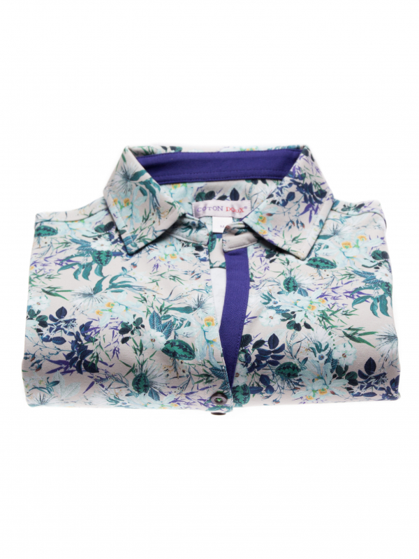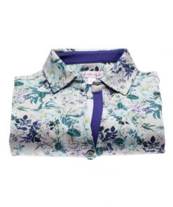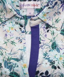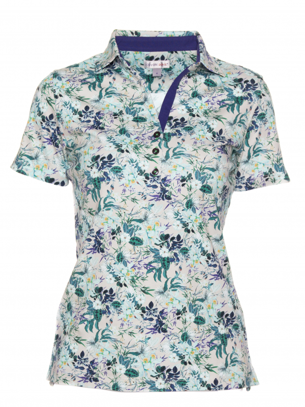 The pretty days are coming and the flowers are arriving with them! This slim fit polo shirt with a green and blue floral print will fit perfectly in your wardrobe. To match with a blue chino and a light green skirt. Made with jersey of cotton, piqué collar and three-button placket, this polo shirt will provide you comfort and elegance.