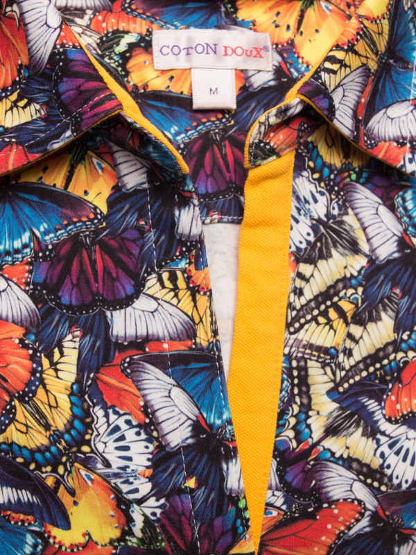 This butterfly print polo will ensure you a style full of colors, for winter as well as summer, thanks to the different shades and the mercerized cotton jersey. Its orange piqué cotton collar and three-button placket will nicely contrast with navy blue chino pants or jeans. And you will love wearing its slim cut.
