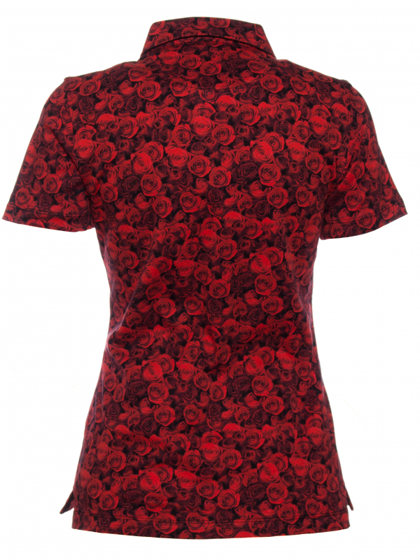 Make this red roses print your best asset with this kissing short sleeved polo shirt. Its mercerized cotton jersey and three-button placket will make it charming and casual while its plain piqué cotton collar will give it elegance. Black skirt and pumps will sublimate everything for a most fatal style!