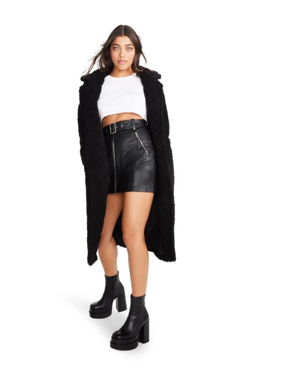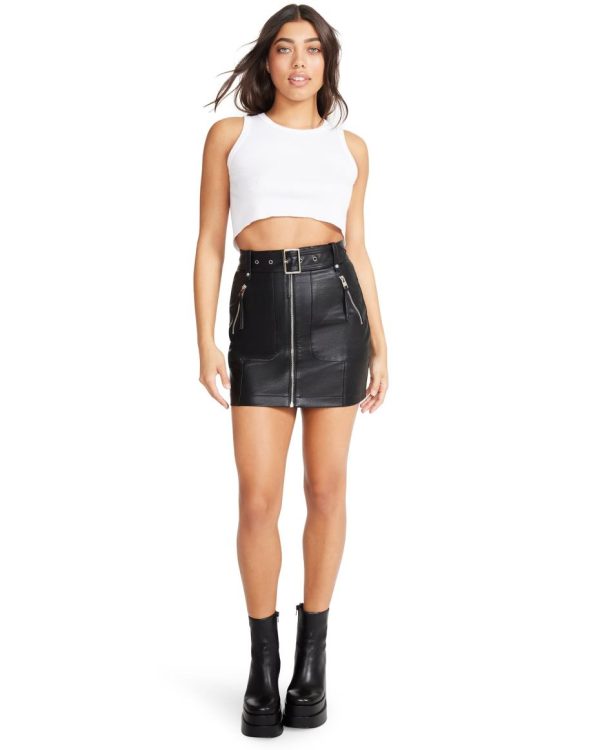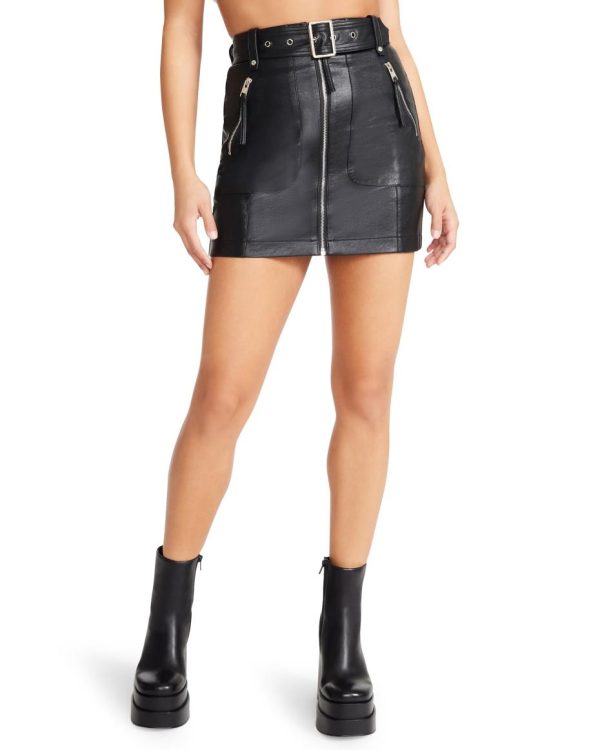 Every wardrobe needs a cool faux leather moto mini skirt. This style features a zipper front and buckle detail for the perfect day or night look.