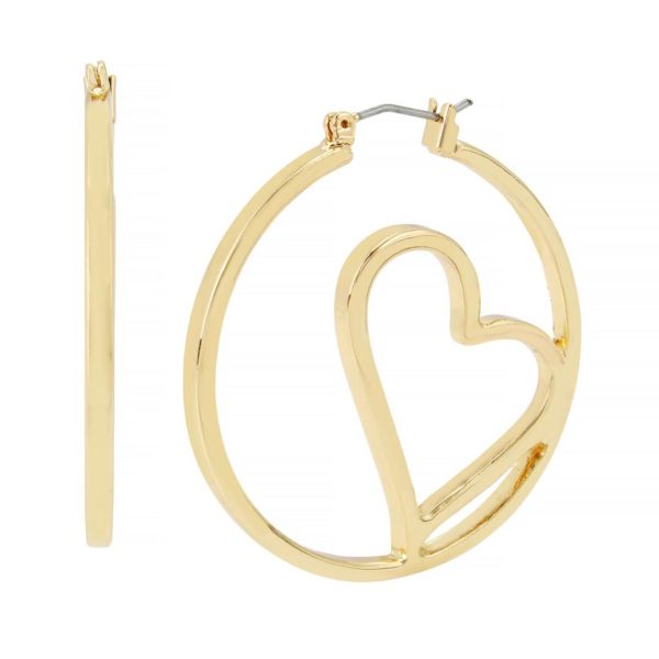 Medium-sized hoop earrings adorned with sculptural heart motif. These everyday earrings are set in polished gold-tone metal and have a click-top closure.
