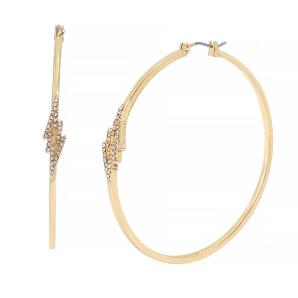 Large-sized sleek hoop earrings with lightning bolt motif at front adorned with glistening crystal pave. These striking earrings are set in polished gold-tone metal and have a click-top closure.