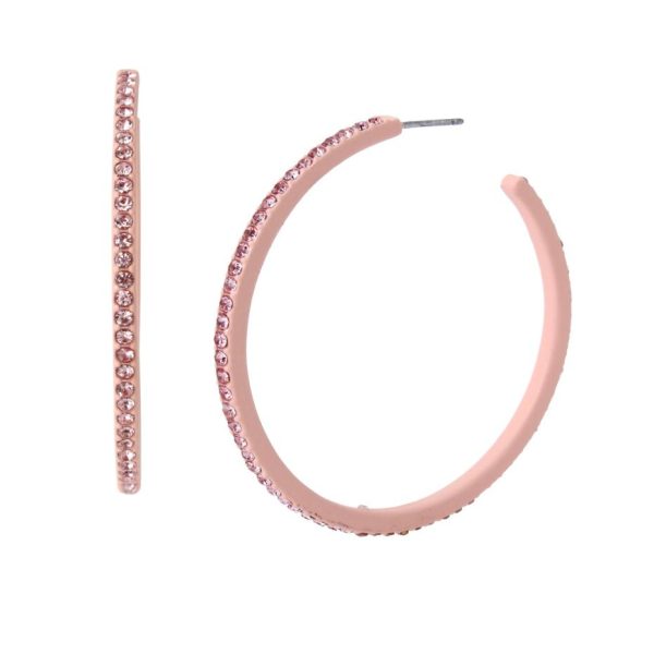 Sleek and skinny minimal open hoop earrings adorned with glistening jet colored pave. These sparkly earrings are set in matte blush-plated metal and have a post back closure.
