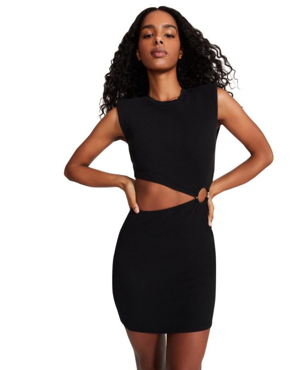Cindy Crawford vibes. The Shoulder Pad Cut Out Mini Dress features a peek-a-boo waist with a retro-chic circle ring.