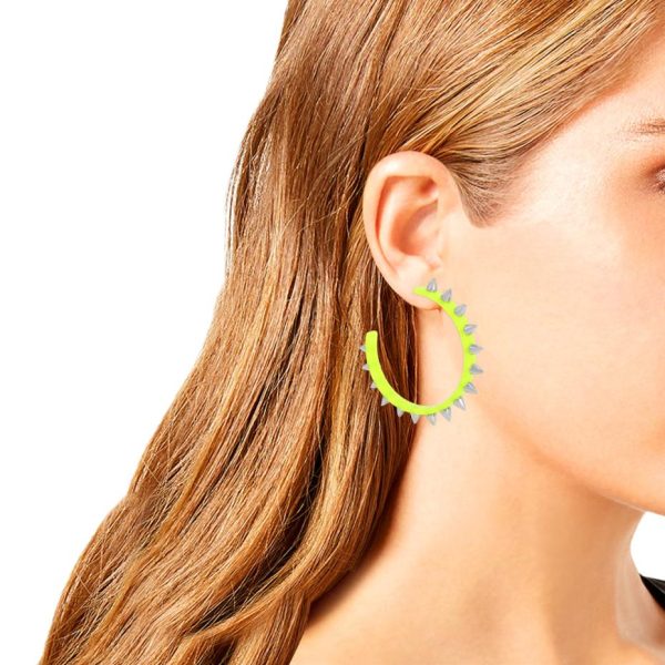 Vibrant green resin open hoop earrings adorned with spikey metal hardware. These bright earrings are set in polished gold-tone metal and have a post back closure.